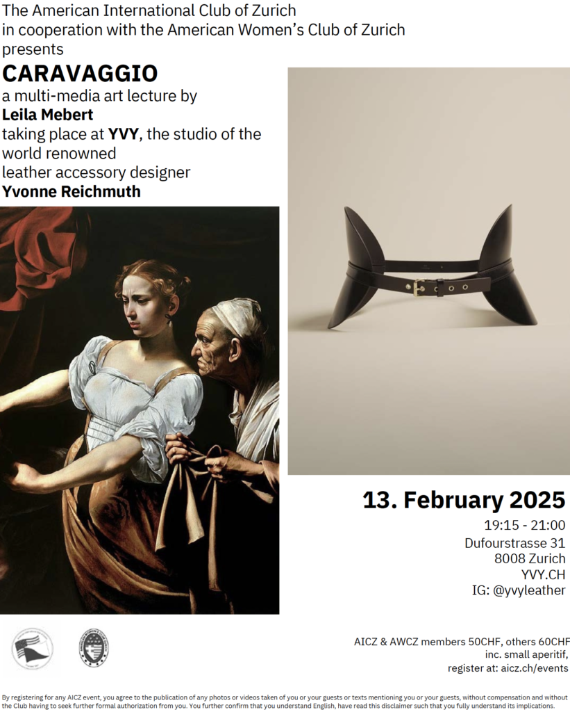 Our next art lecture in our series is on Caravaggio, the fascinating Italian painter who broke out of the mold in the late 16th century, to be held on Thursday, February 13 at 19:15. Once again the American Women’s Club of Zurich will participate. It will be held at YVY, the shop and studio of the world renowned leather designer Yvonne Reichmuth, at Dufourstrasse 31, 8008 Zurich …an 8 minute walk from Bellevue.