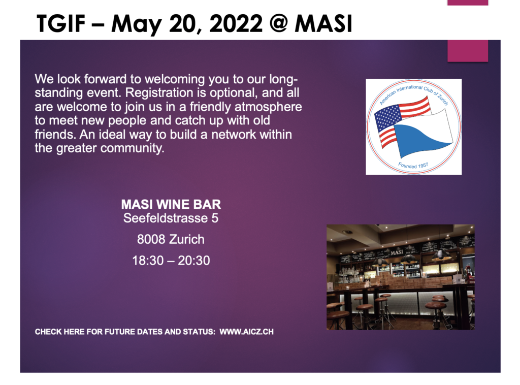 By registering for any AICZ event, you agree to the publication of any photos or videos taken of you or your guests or texts mentioning you or your guests, without compensation and without the Club having to seek further formal authorization from you. You further confirm that you understand English, have read this disclaimer such that you fully understand its implications.